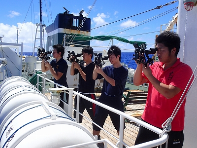 写真は、六分儀(ろくぶんぎ:天体高度を測って船の位置を知るための観測機器)を使用しているところです。